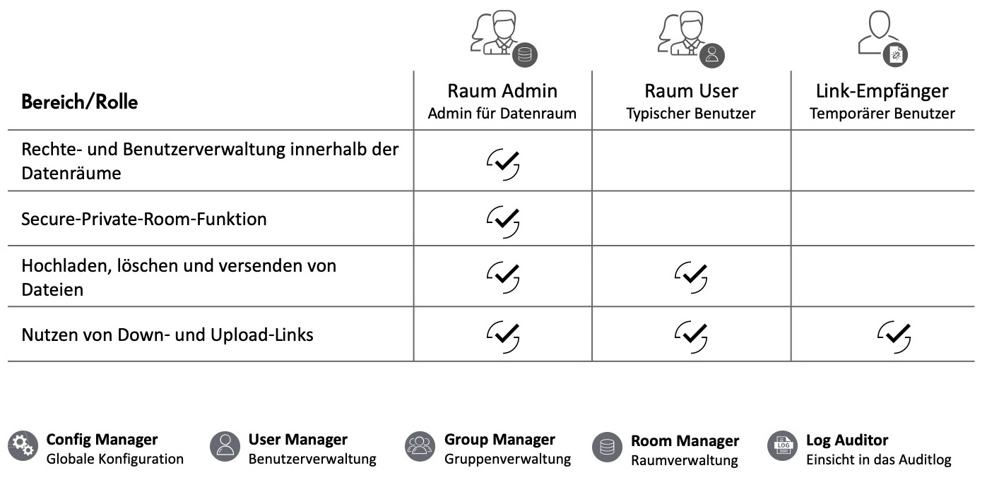 Bei DRACOON ist ein rollenbasiertes Berechtigungskonzept integriert, auf dem die gesamte Verwaltung basiert. Durch diese Rollenbasierung ist es möglich, die Verwaltung von Abteilungsdaten direkt in die entsprechenden Abteilungen zu verlagern, die sich anschließend selbst verwalten können.